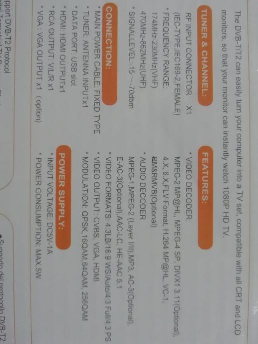 Prodajem novi nekorišteni kompletan DVB/T2 prijemnik sa H.264 kodekom (Slovenia, Mađarska, Srbija, BiH) s izlazima na TV (HDMI), monitor(VGA), snimanje na USB2.0, ima PiP (slika u slici), Mpeg4,2&AVI, Mp3, FullHD (HD1080P) TimeShifting, EPG,