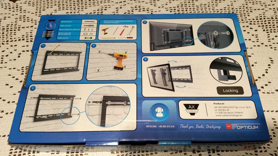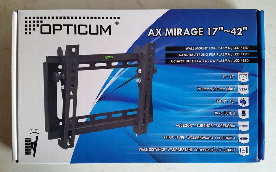 OPTICUM AX MIRAGE, novi, neraspakirani, zidni nosač za LED, LCD i Plazma televizore težine do 30 kg i veličine do 42" tj. do 107 cm s mogućnošću vertikalnog nagiba....Razmak rupa na poleđini televizora može biti 20 x 20 cm...... Jednostavna montaža...... Svi vijci i tiple u kompletu (čak i libela za postavljanje stalka u vodoravni položaj)....Proizvedeno u Poljskoj.....Preporučena pošiljka poštom stoji 25 kn. (moguće slanje poštom uz prethodno plaćanje cjelokupnog iznosa od 115 kn na moj račun) Ludbreško područje i VŽ, ČK, KC moguće osobno preuzimanje