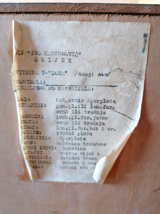 To je Vitrina T-DORA, gornji i donji dio, koja je proizvedena u poznatoj tvornici namještaja IVO MARINKOVIĆ u Osijeku 1960-ih godina, tj. prije više od 65 godina.