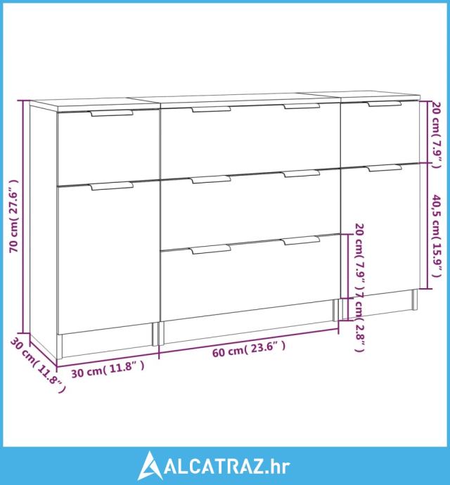 - Dimenzije (komoda s 3 ladice): 60 x 30 x 70 cm (Š x D x V)