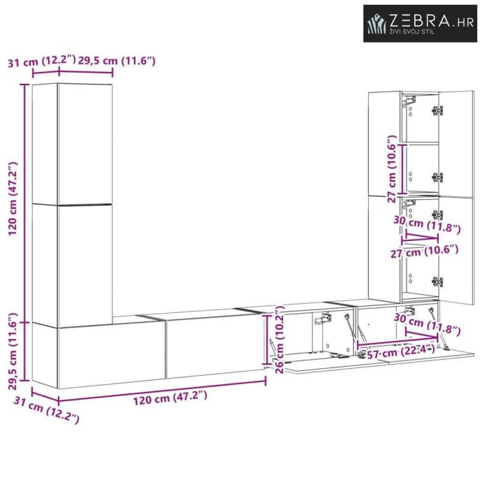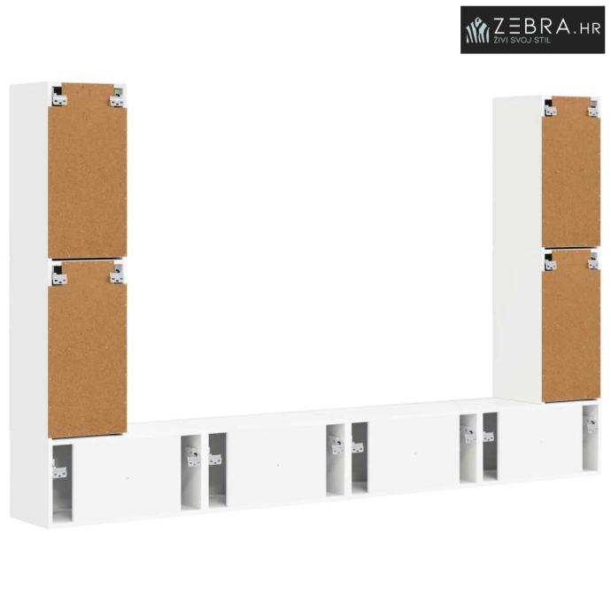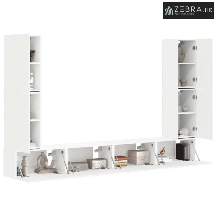 Komponente i pohrana: Ovaj set namještaja dolazi s raznim pretincima, ladicama i kliznim vratima, nudeći puno prostora za elektroniku, medijske dodatke i dekoracije. Dizajniran je s praktičnošću na umu, omogućujući lako pristupanje i organizaciju, držeći nered daleko od očiju, ali uvijek nadohvat ruke.