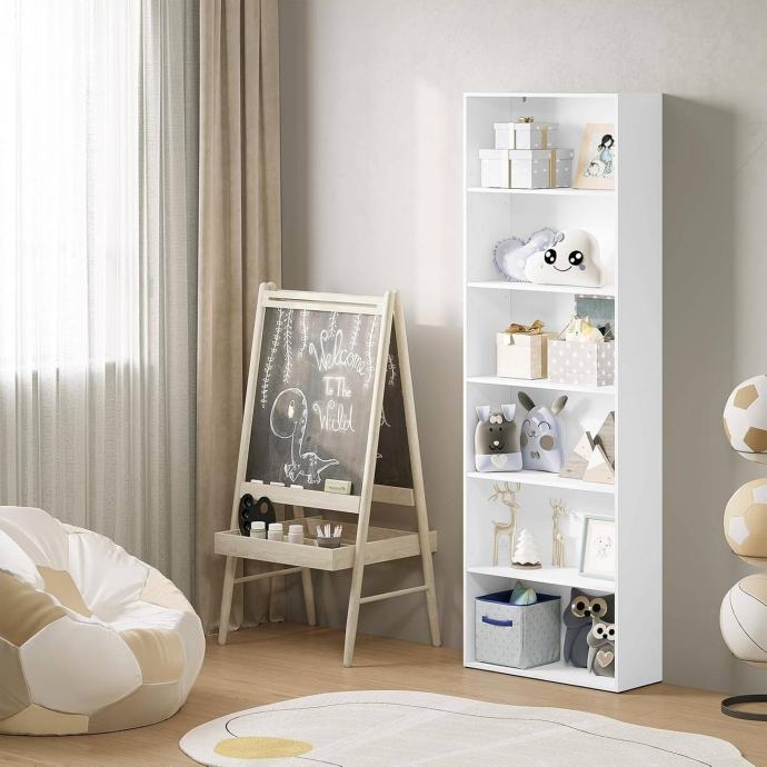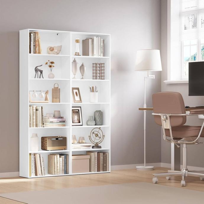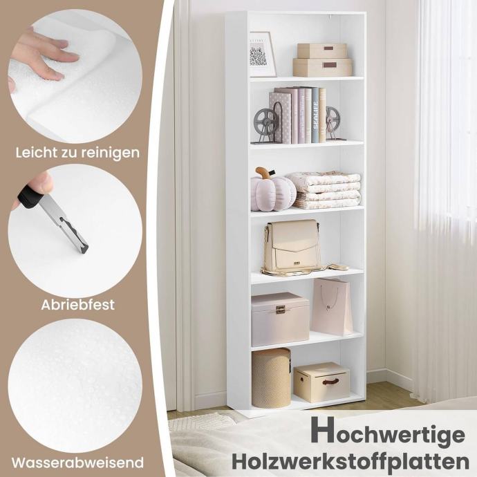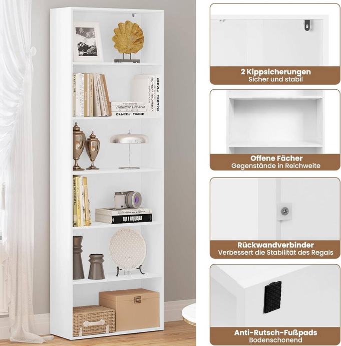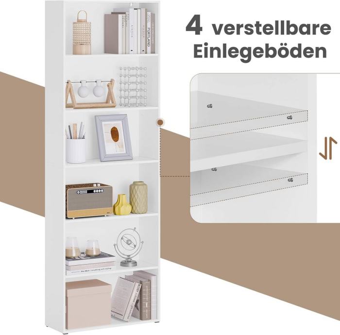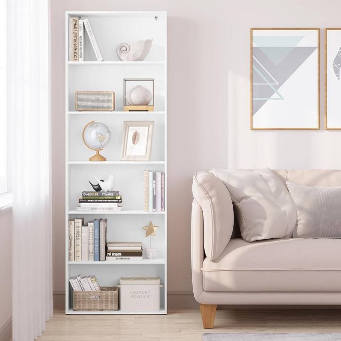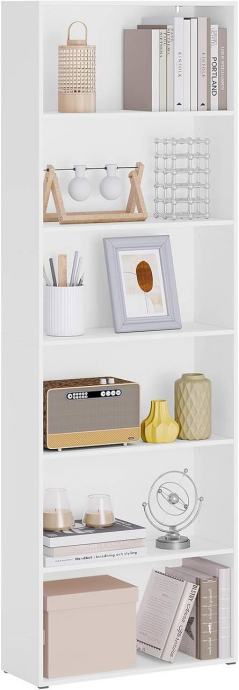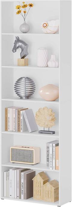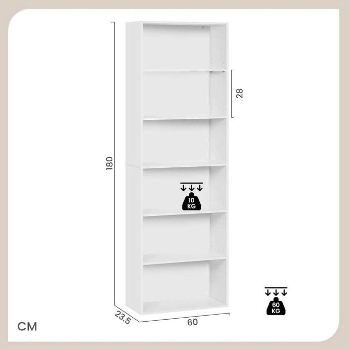 Puno prostora za pohranu: Visoka stojna polica s 6 otvorenih odjeljaka (57,6 x 27,6 x 23,5 cm svaki, nosivost 10 kg, podesivi 4 cm gore/dolje) zauzima malo prostora na podu, ali optimalno koristi vertikalni prostor. Idealna je za knjige, okvire, figurice, trofeje, biljke i druge predmete, donoseći red u vaš prostor.