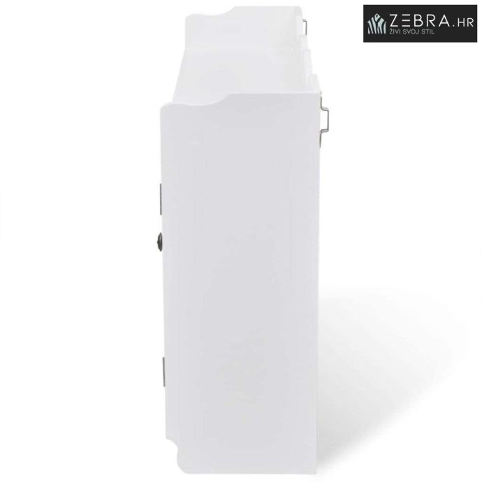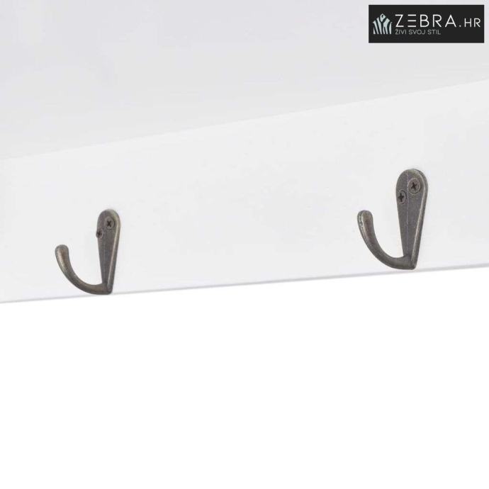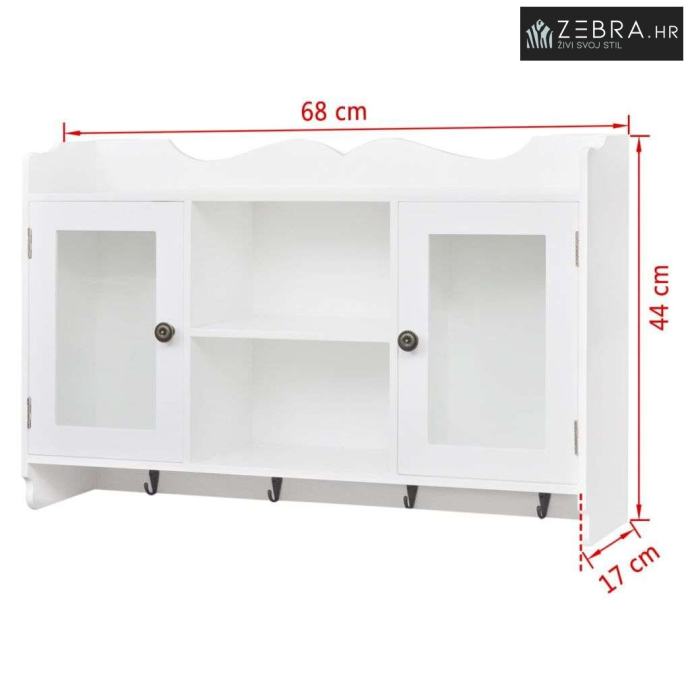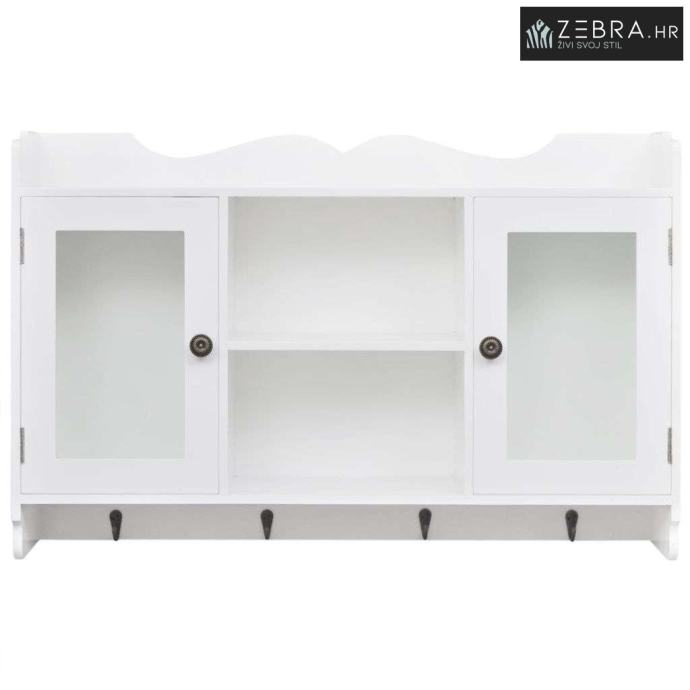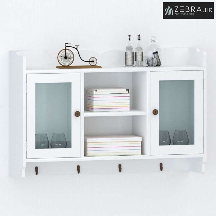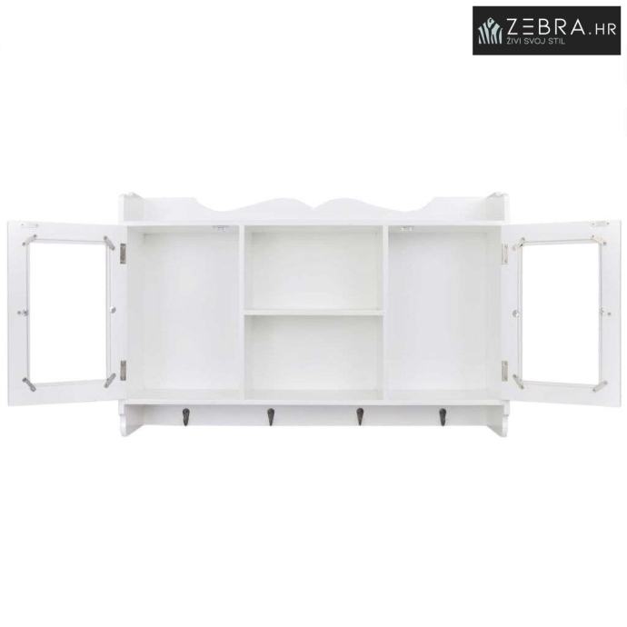 Viseći ormarić napravljen je od visokokvalitetnog obojenog MDF-a. Ima dvoja staklena vrata za zaštitu predmeta od prašine. Pomoću 4 kuka na dnu ormarića možete objesiti kapute, torbe, kape, ključeve itd.