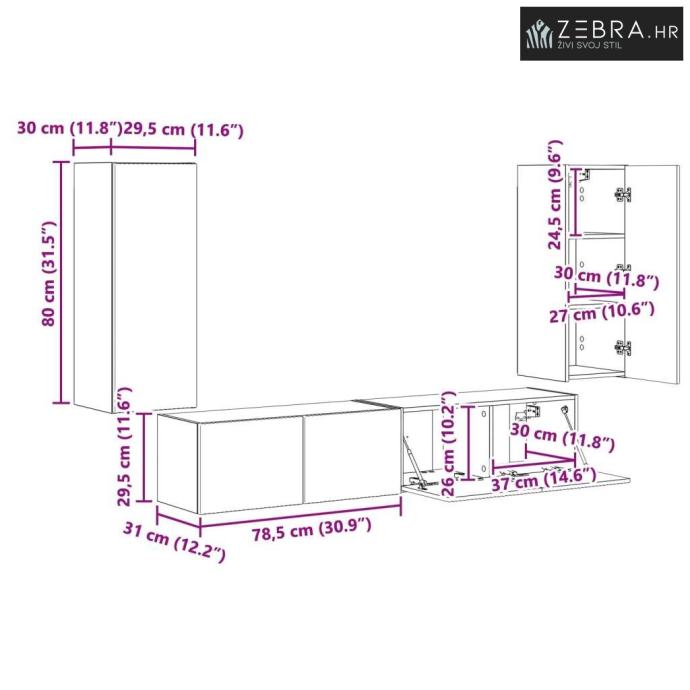 2 x TV zidni ormar: 78.5 x 30 x 29.5 cm (D x Š x V)