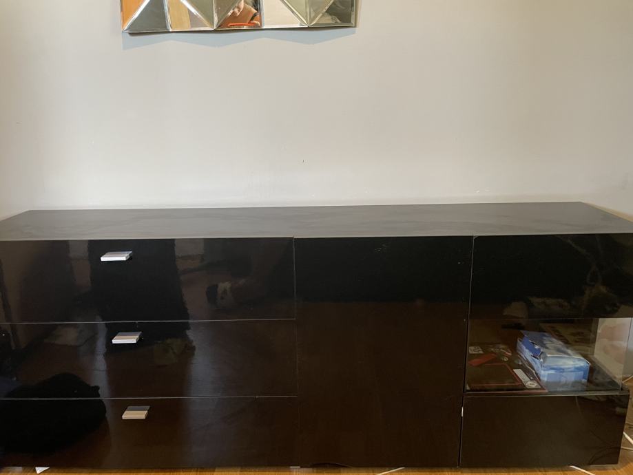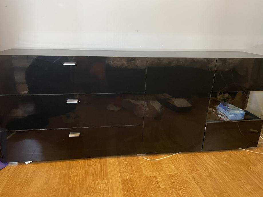 Prodajem crnu komodu sa srebrnim ruckama.Prednja strana visoki sjaj a gornja strana mat.Jako ocuvana.Placena 1500 kn,kupljena u lesnini.