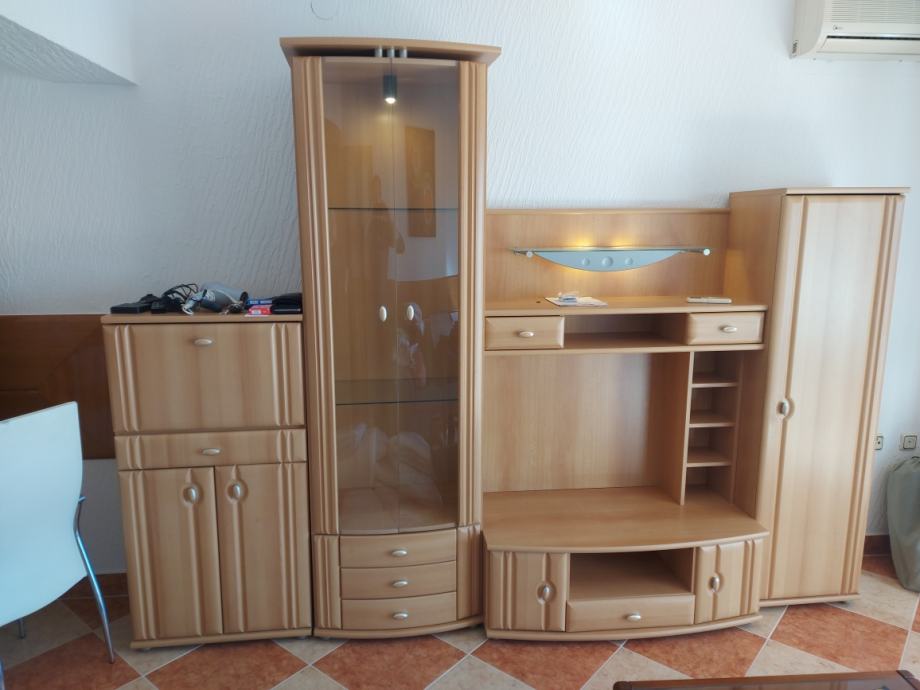 Boja svijetlo drvo. Set uključuje vitrinu sa staklom, ormariće, ladice i TV element.