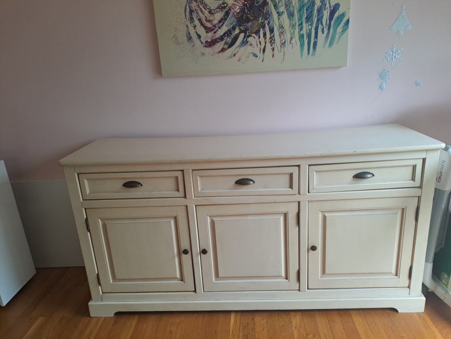 Prodajem drvenu komodu kupljenu u Emmezeti prije desetak godina za 3500,00kn. Komoda ima dva oštećenja,jedno je da treba i može se zakucati stražnji dio komode a drugo je da su na površini različite dvije boje zbog prijašnjeg postojanja gornjeg djela što je moguće prefarbati ( vidljivo na slici dva). Komoda je inače puna prostora za pohranu (police,ladice),od pravog je drveta, uklapa se u sve interijere i ugodna je oku. Zbog navedenih oštećenja je cijena prilagođena.