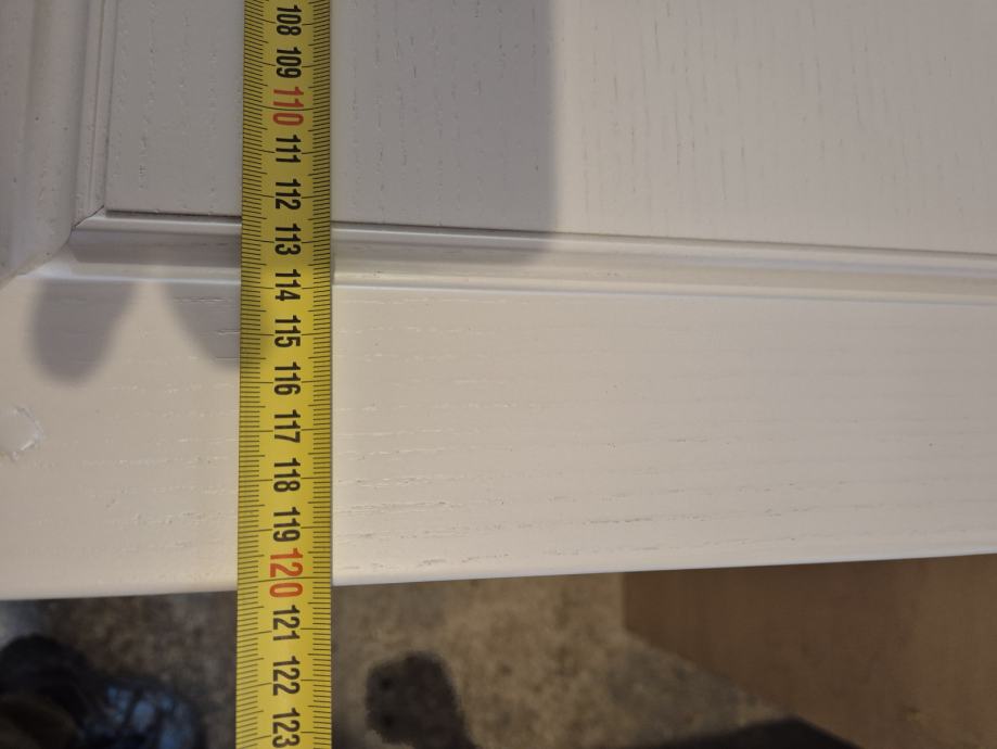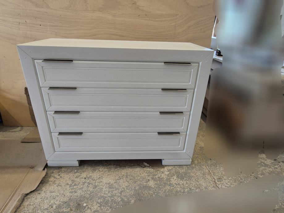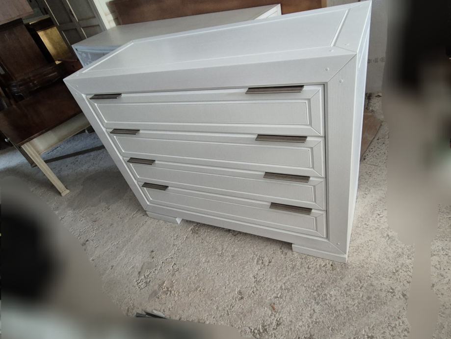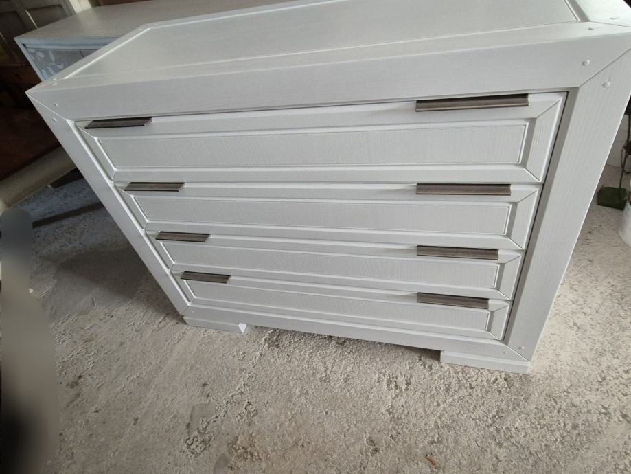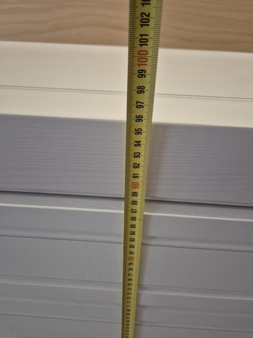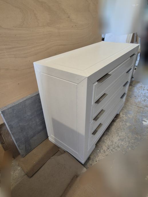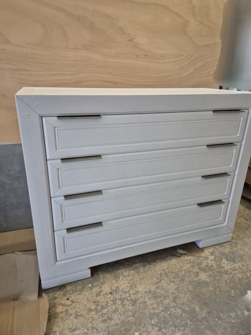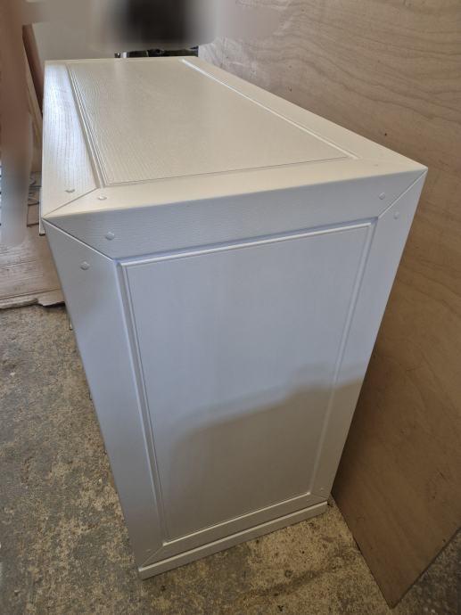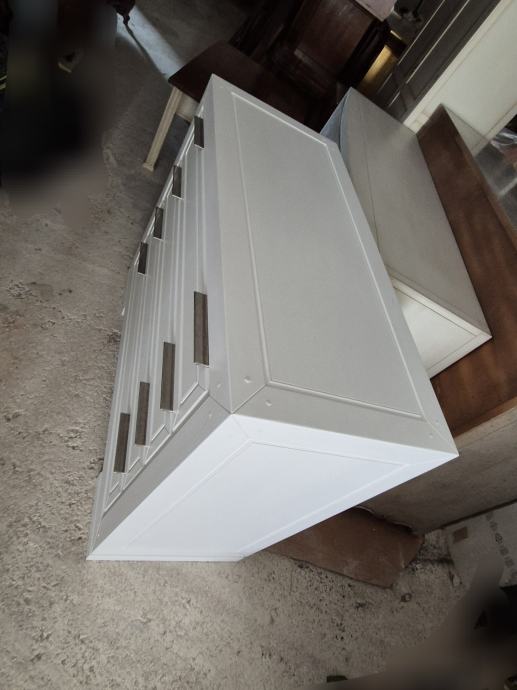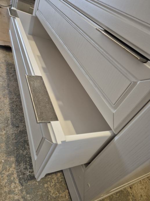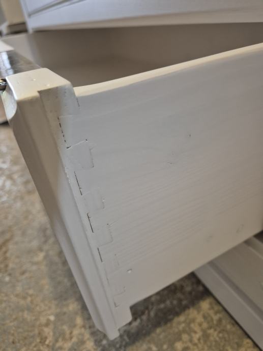 Ima lijepe godove ...spajano pod 45 ...i sve lijepo i pedantno. Ladice također drvene..spojene u lastin rep. Lakirana u snijeg bijelu boju.Ruckice lijepe jake čvrste