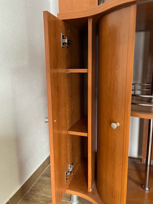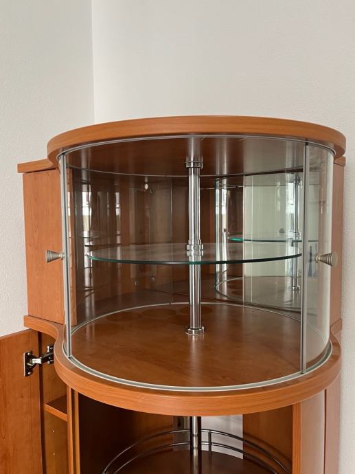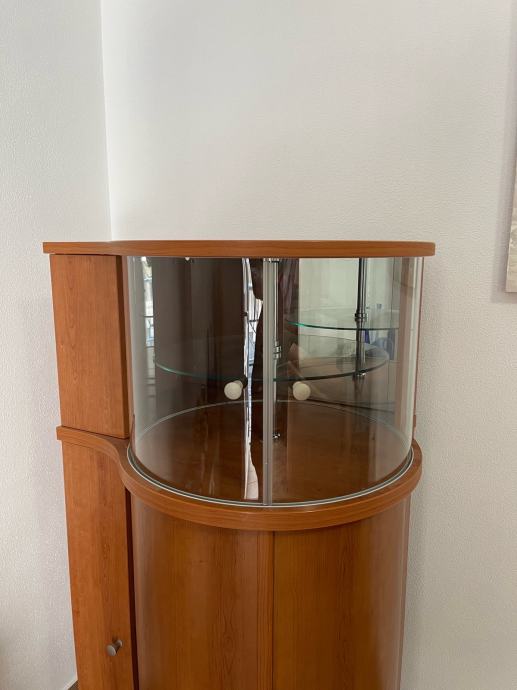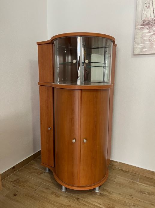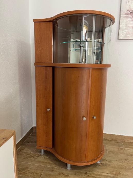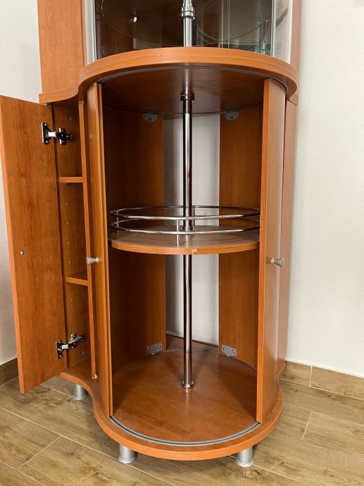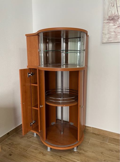 Prodajem elegantan drveni vitrin-ormarić s rotirajućim policama i staklenim gornjim dijelom. Odličan je za dnevni boravak, blagovaonicu ili kao barski ormarić. Prostran, kvalitetan i vrlo praktičan.