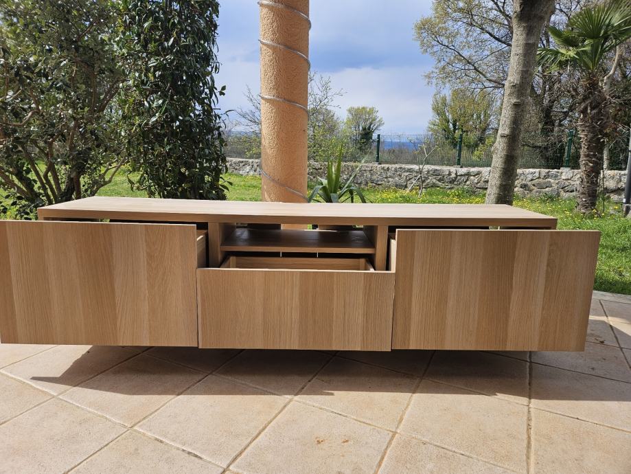 Ikea Besta tv klupa, efekt bijelo bajcanog hrasta, 180x42x39 cm. Ima ostecenje na lijevoj bocnoj strani.