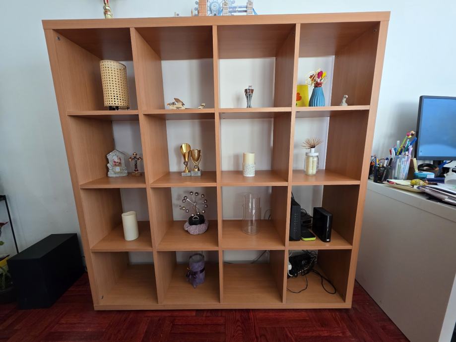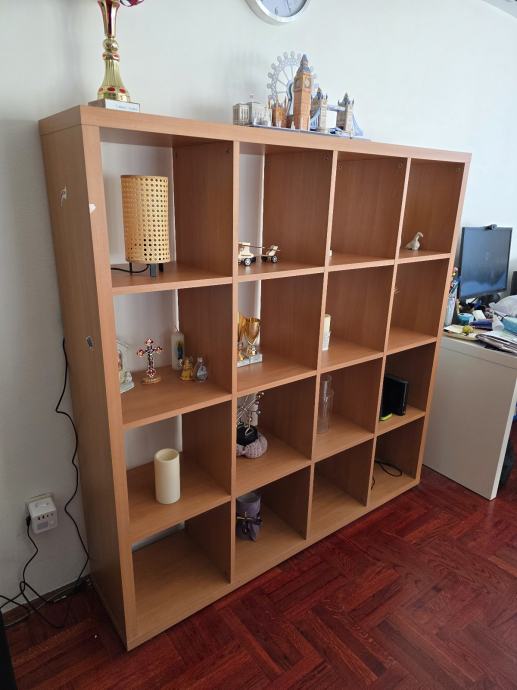 Prodajem IKEA Kallax regal u konfiguraciji 4x4, dimenzija 147x147 cm. Regal je u toplijoj drvenoj boji, s ukupno 16 otvorenih pregrada jednakih dimenzija. Solidna je to i prostrana jedinica koja pruža dosta prostora za odlaganje i izlaganje raznih predmeta.