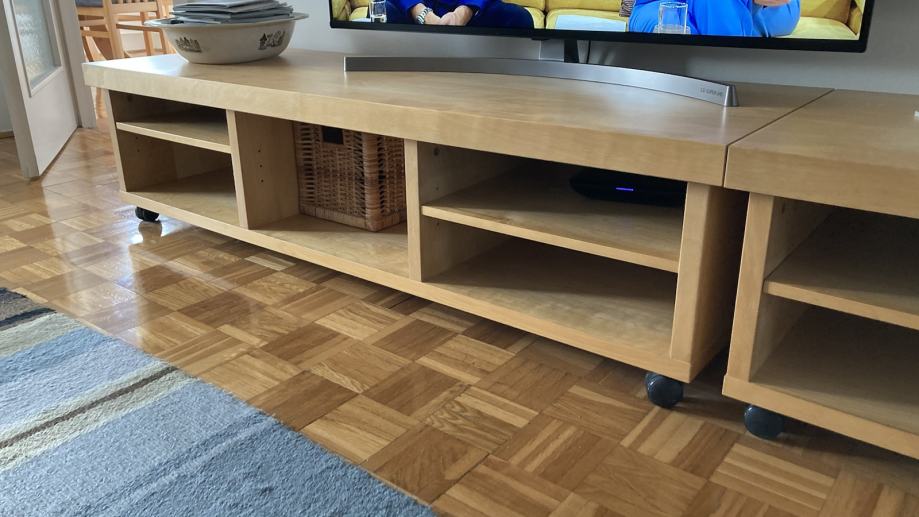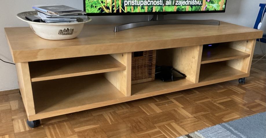 Ikea Oppli TV klupa dimenzije: duzina 150 x dubina 50 x visina 40 cm na kotacicima boja bukva.