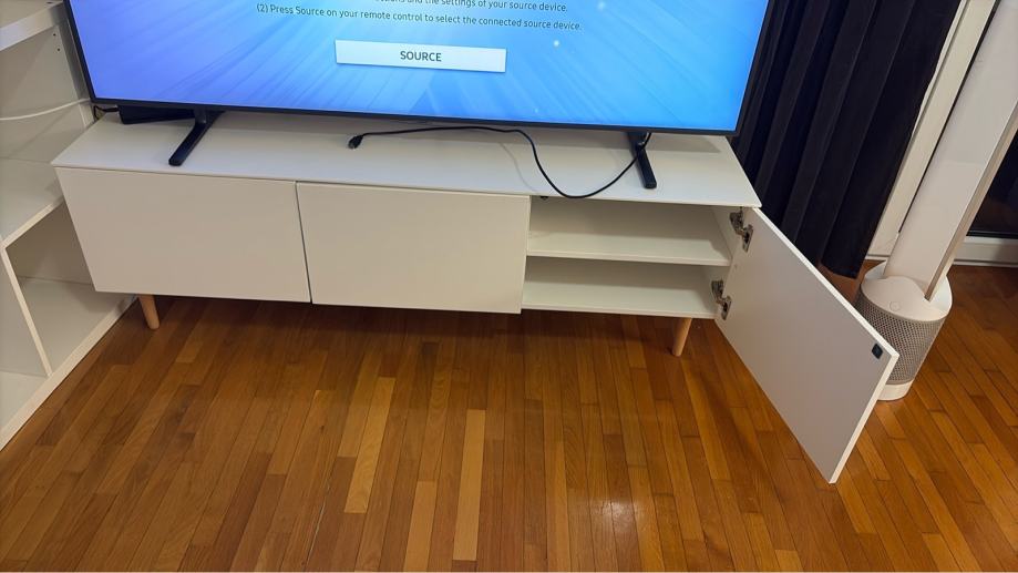 Prodajem IKEA ormarić za TV, dimenzija 150 cm širine, 60 cm dubine i 50 cm visine. Bijele je boje s drvenim nogicama, a sastoji se od vrata i otvorenih polica koje pružaju dovoljno prostora za smještaj različitih uređaja i opreme. Ormarić je u savršenom stanju.