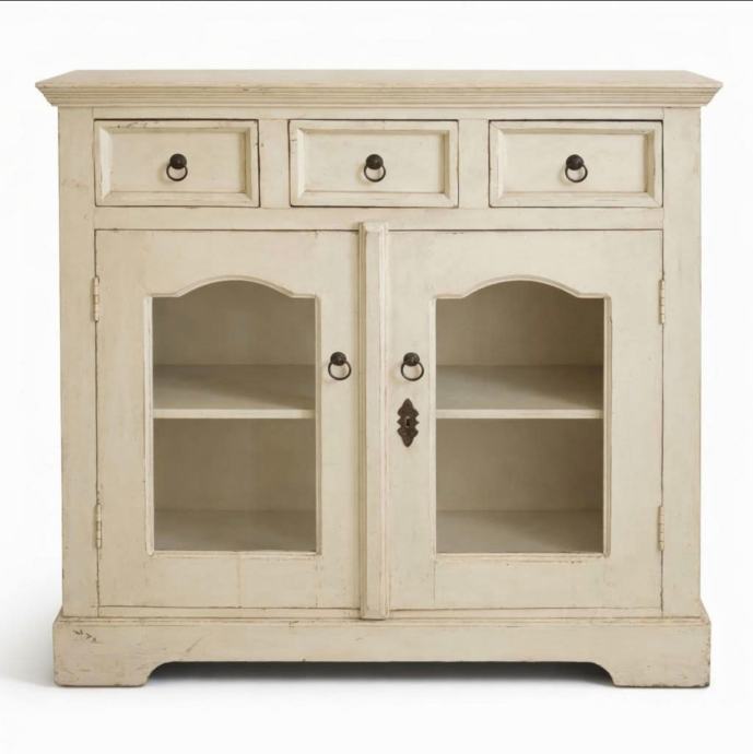 Masivan i kvalitetan komad namještaja rustikalnog izgleda, s tri ladice i dvokrilnim vratima sa staklom.