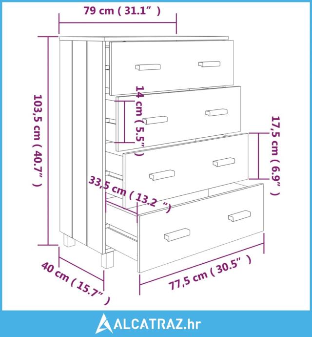 Ladičar je izrađen od masivne borovine, zbog čega je stabilan i čvrst. Visoka komoda ima 4 ladice koje glatko klize i pružaju dovoljno prostora za držanje vaših raznih dnevnih potrepština dobro organiziranima i na dohvat ruke. Osim toga, čvrsta stolna ploča savršena je za izlaganje ukrasnih predmeta, okvira s fotografijama i biljaka lončanica.