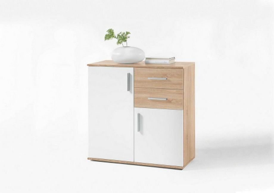 Komoda BOBBY kombinira topao izgled replike hrasta sonoma s jasnoćom bijele boje i tako se skladno uklapa u različite koncepte prostorija. S veličinom od cca 80x82x35 cm, nudi dovoljno prostora za pohranjivanje vašeg pribora i istovremeno osigurava red. Opremljen s 2 vrata i 2 ladice, lako možete pohraniti i veće i manje predmete i uvijek imati sve pri ruci.