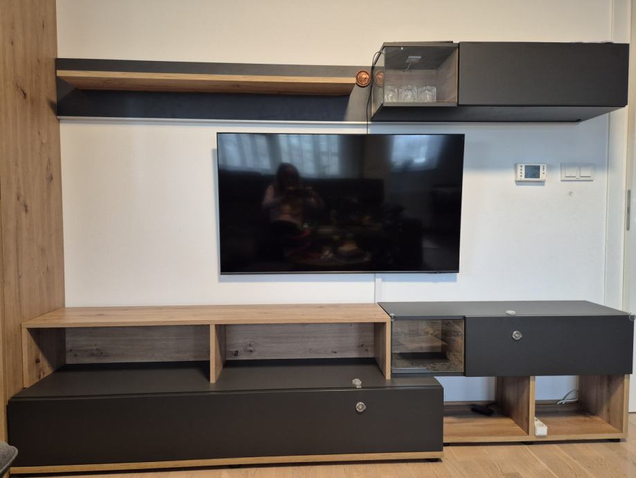 Jako malo korišteno, kombinacija boja hrasta i sive boje. Savršeno stanje, samo polica ima jednu rupu prilikom postavljanja na zid. Dimenzije su 242 cm dužina, širina 40 cm, visina 55 cm.