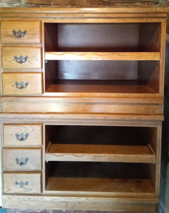 Dva indentična dijela regala, dimenzije 92x60.58,puno drvo.Može služiti kao ormarić za TV,ili komoda.Srednja polica je na izvlaćenje.