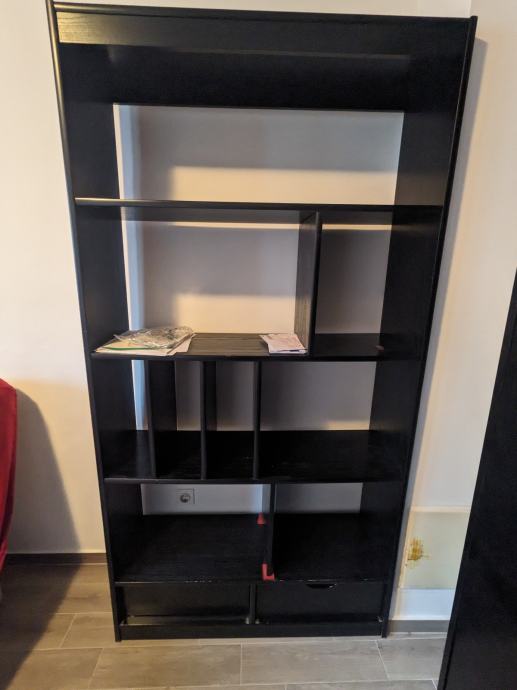 Prodajem rabljenu komodu za dnevni boravak. Komoda dolazi s više otvorenih polica različitih veličina koje nude dosta prostora za odlaganje i organizaciju stvari. Tamne je boje, što joj daje elegantan izgled koji se lako uklapa u različite interijere.