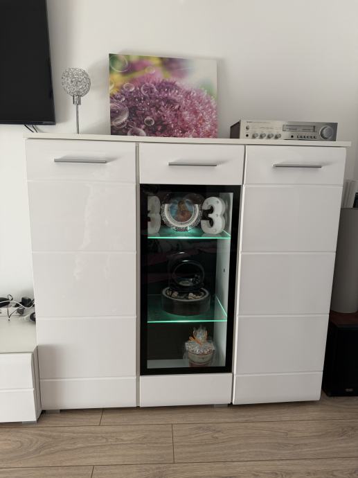 Komoda je bijela visokog sjaja