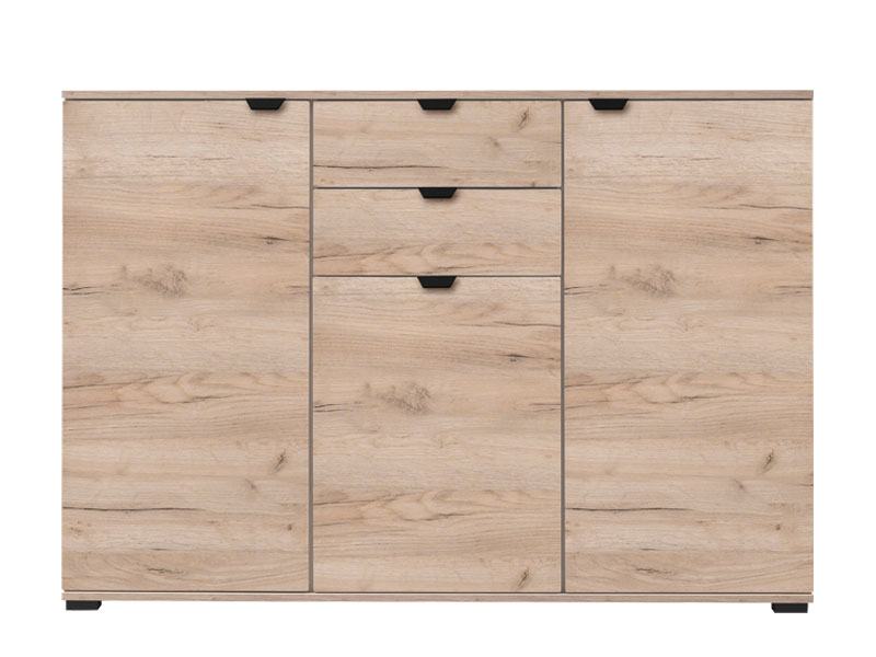 Prostrana i funkcionalna komoda koja nudi odličnu kombinaciju spremišnog prostora. Opremljena je s tri ormarića i dvjema ladicama, što omogućuje preglednu organizaciju odjeće, posuđa ili drugih potrepština. Gornja ploha može se koristiti za dekoracije, lampe ili praktične dodatke.