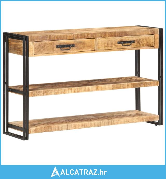 Ova komoda za pohranu napravljena je od masivnog drva manga, tropskog tvrdog drva. Ima snagu da izdrži težinu, a također podnosi trošenje uzrokovano vremenom. Uz to, izvrsna izrada i lijepi drveni godovi čine svaki primjerak malo drukčijim od sljedećeg. Snažni okvir od željeza obloženog prahom pridonosi čvrstoći komode. Čvrsta površina idealna je za izlaganje ukrasnih predmeta, poput okvira s fotografijama ili biljaka lončanica. Uz to, ovaj konzolni stol sadrži 2 ladice i 2 police, tako da možete držati knjige, časopise i ostale predmete dobro organiziranima i na dohvat ruke.