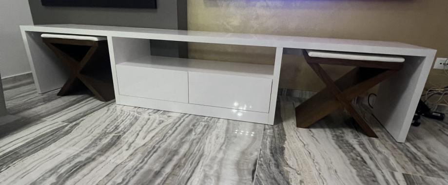 prodajem komodu u odličnom stanju,kao nova. Visoki sjaj, dvije ladice i dva stolca od hrastovog drveta sa sjedištem od prave kože. dimenzija komode je 278x50x55