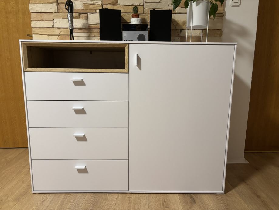 Prodajem komodu bijele boje s policom boje hrasta, dimenzije 121x92,8x43 cm. Očuvana je i u odličnom stanju.