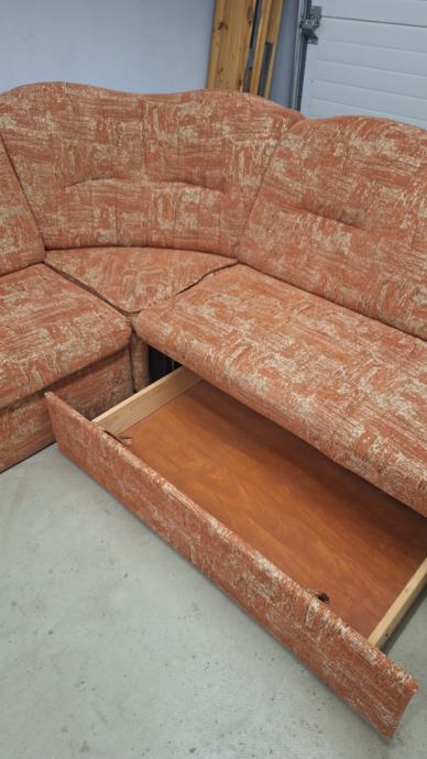 Prodajem kutnugarnituru s praktičnom ladicom za odlaganje ispod sjedala. Garnitura je u narančastoj boji s uzorkom, udobna i funkcionalna. Ladica pruža dodatni prostor za pohranu, što je korisno u manjim prostorima. Pogodna za dnevni boravak.