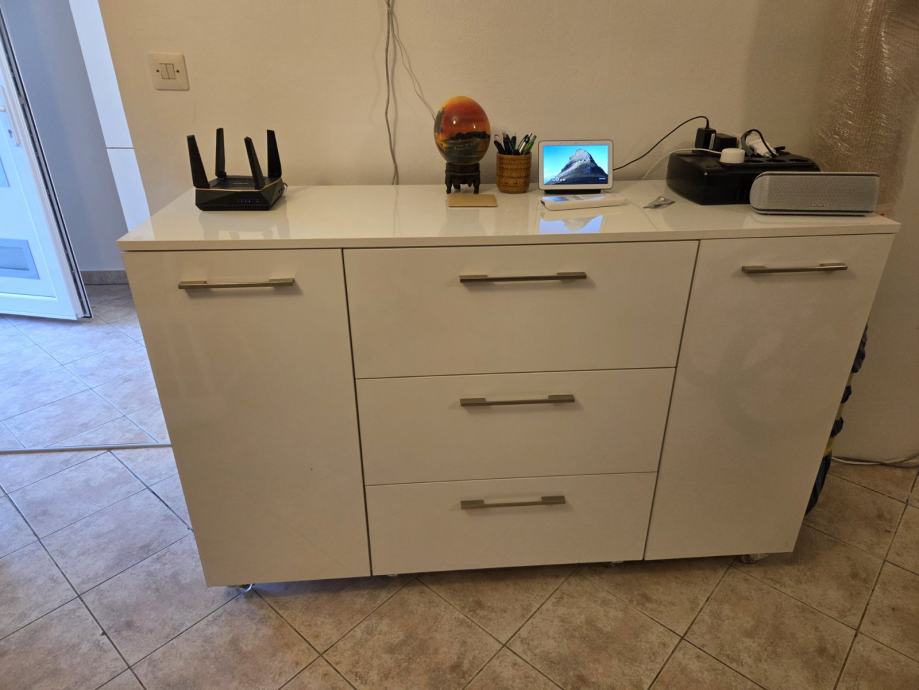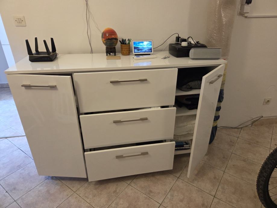 Prodajem komodu, bijelu, visoki sjaj, izrađenu po mjeri, sa tri ladice u sredini i dva bočna elementa svaki sa četiri police.