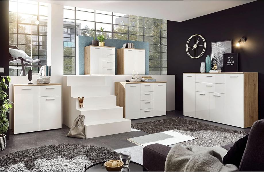 -Moderan dizajn – bijele fronte visokog sjaja i srebrne ručke vašoj dnevnoj sobi daju elegantan stil. Korpusi u toplom izgledu Artisan hrasta pružaju domaću atmosferu.