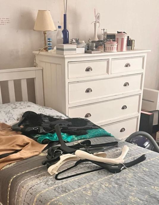 Bijela drvena komoda od punog drveta s 3 velike i 2 manje ladice, dimenzija 113 cm x 60 cm x 110 cm. Cvrsta, ocuvana, gotovo ne koristena, s malim ostecenjima na mjestima gdje je popucala boja