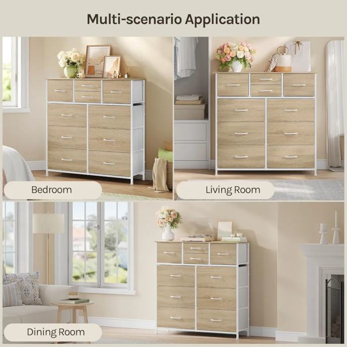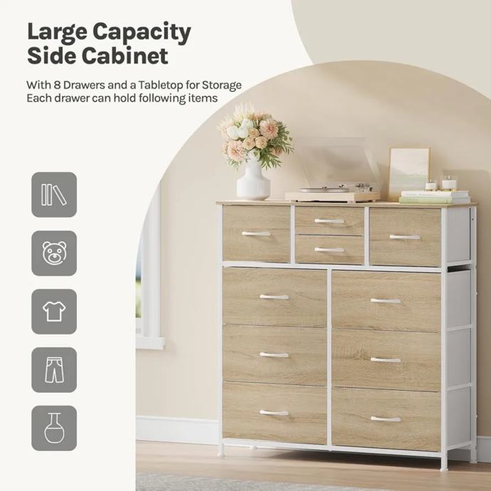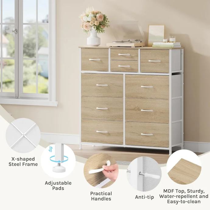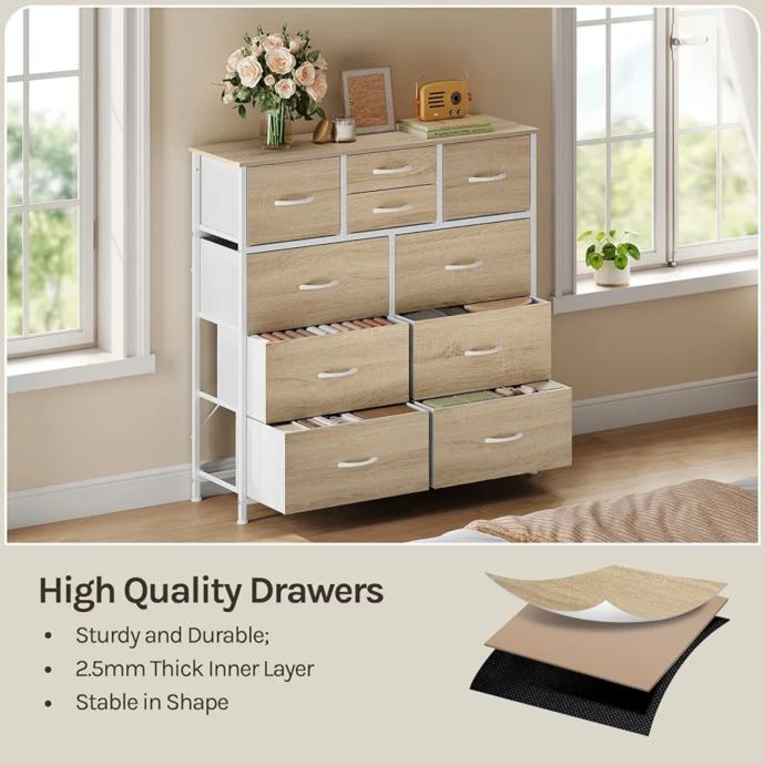 Komoda, 10 ladica za pohranu u 3 veličine za spavaću sobu/hodnik/dnevni boravak, Jedinica s ladicama od tkanine, efekt svijetlog hrasta + bijela, metalni okvir, E1 inženjersko drvo, SSK009whe