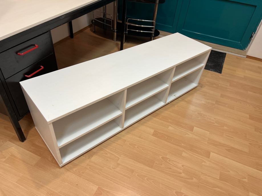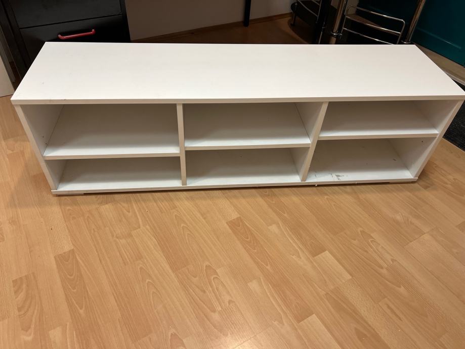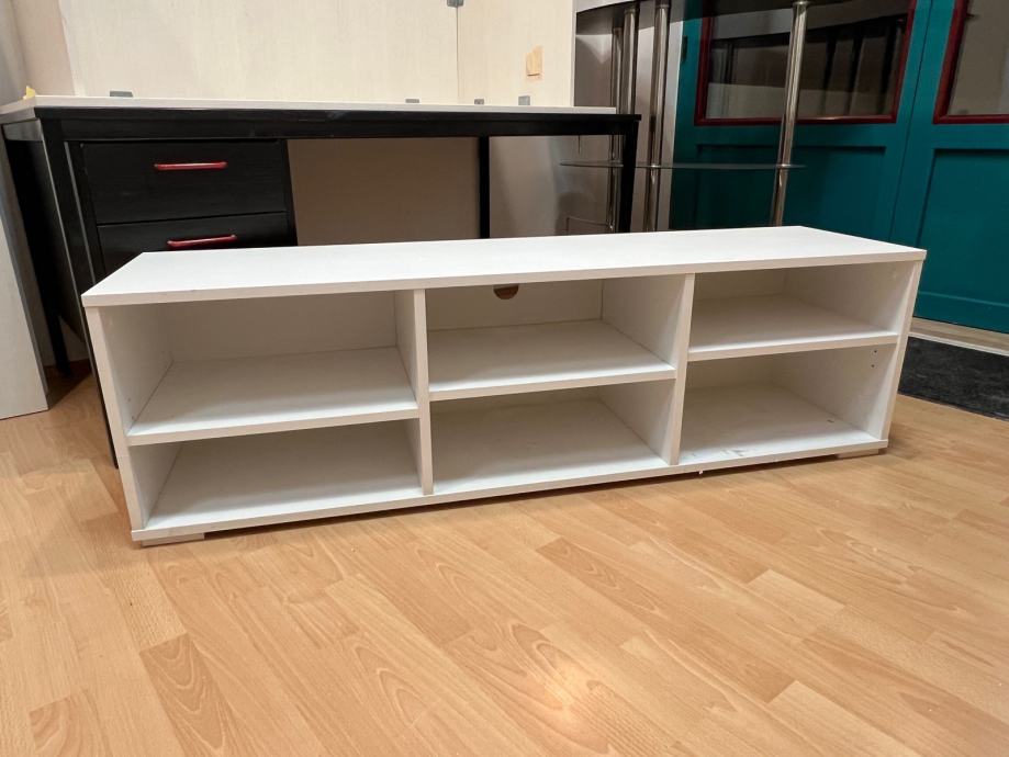 Prodajem komodu koja služi kao TV stalak, dimenzija: 150 x 40 cm, visina = 44 cm, bijele boje u vrlo dobrom stanju. Komoda ima šest otvorenih pretinca raspoređenih u dva reda i tri stupca, što pruža dovoljno prostora za smještaj raznih stvari. Niska je i dugačka, pa odgovara postavljanju televizora na vrh. Izvedba je jednostavna i čista, lako se uklapa u različite uređaje dnevnog boravka.