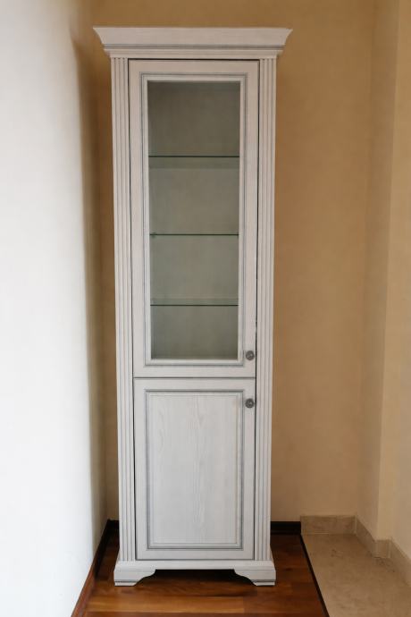 Visoka vitrina: Gornji dio sa staklenim vratima i staklenim policama, donji dio zatvoren.