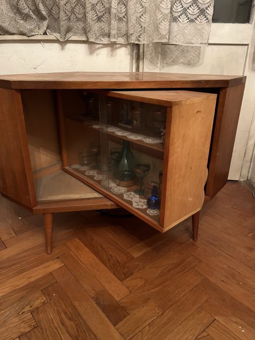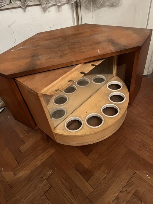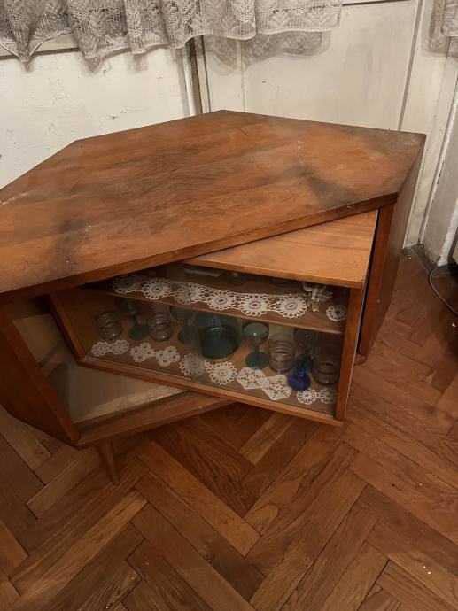 Prodajem kutni bife koji ujedno može poslužiti i kao stolić za TV. S prednje strane su police na koje se mogu staviti različite čaše, a kada se okrene postoje mjesta za boce i čaše na nogici koje se mogu objesiti.