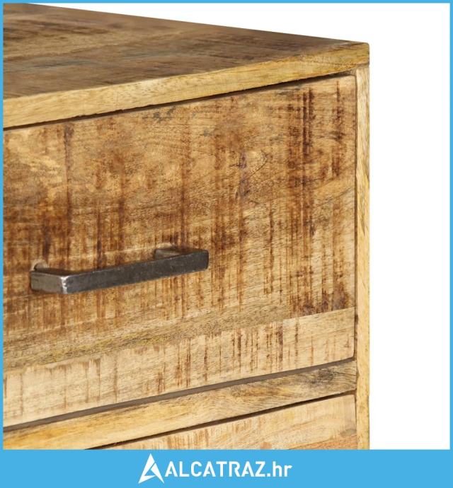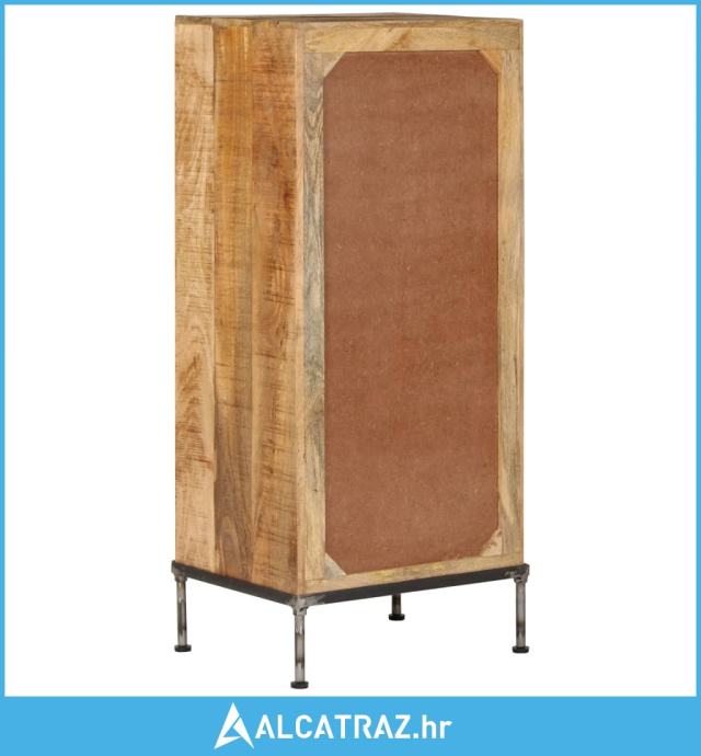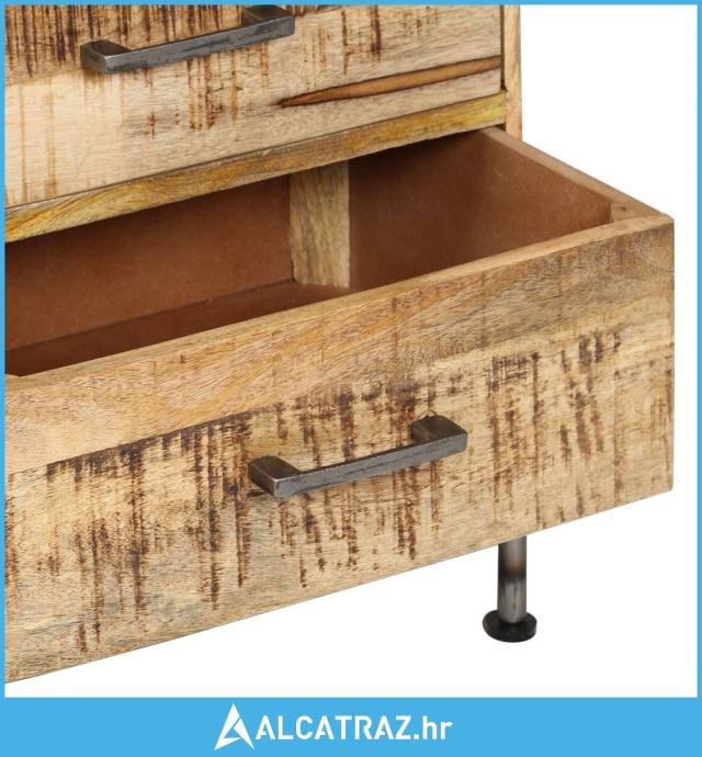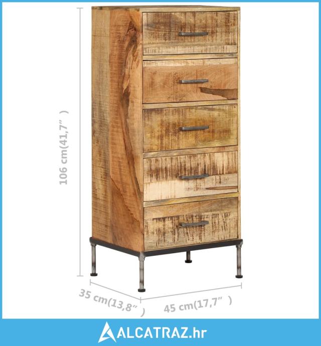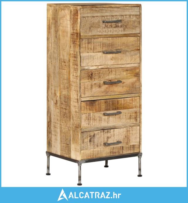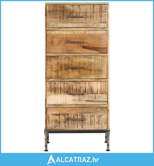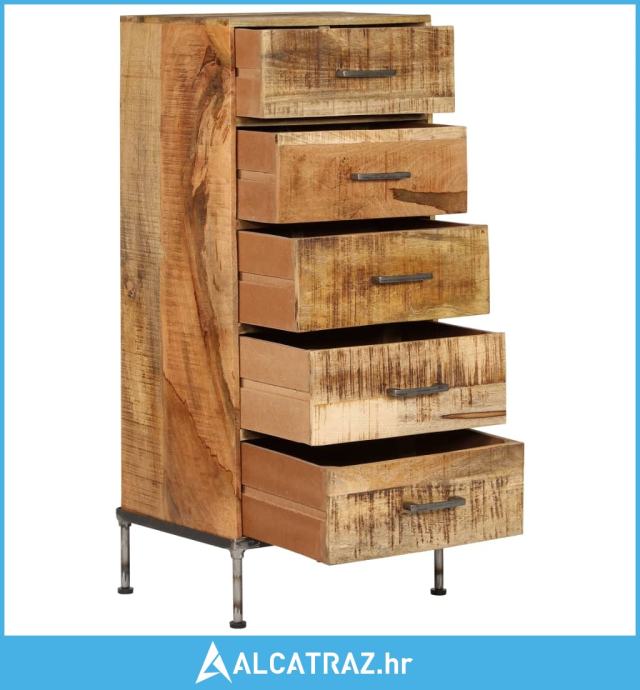 Ovaj ormarić s ladicama napravljen je od masivnog drva manga, tvrdog drva s gustim godovima. Grubo drvo manga odlikuje se snagom da podnese težinu, ali i izdrži trošenje s vremenom. Zbog toga je ovaj lijepo dizajniran bočni ormarić stabilan, izdržljiv i privlačan. Vještina izrade i prekrasni drveni godovi čine svaki komad namještaja jedinstvenim i pomalo drukčijim od ostalih. Željezne ručke pridonose industrijskom stilu ormarića. Osim toga, ova komoda ima 5 ladica koje pružaju dovoljno prostora za spremanje vaše odjeće, knjiga i raznih drugih predmeta.