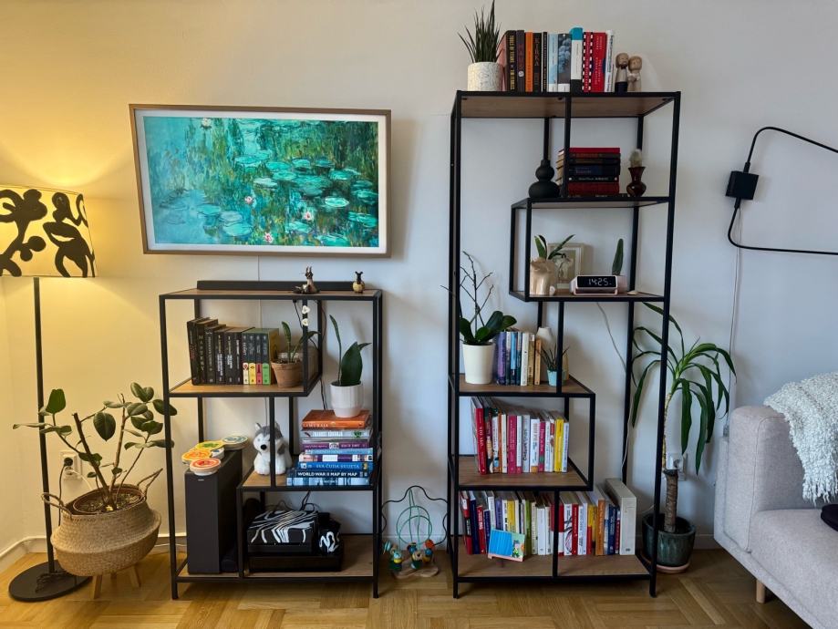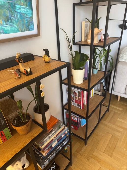 Prodajem set od dva moderna i funkcionalna regala za uređenje dnevnog boravka u industrijskom ili skandinavskom stilu.
