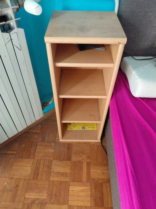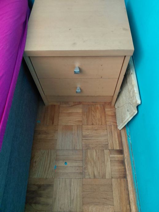 Prodajem komplet namještaja za sobu koji se sastoji od tri komada. Tu su dva jednokreveta s madracima i metalnim uzglavljivačima u srebrnoj boji, okviri su u svijetloj boji drva. Uz krevete dolazi noćni ormarić s dvije ladice i metalnim ručkama, također u svijetloj boji drva. Kompletu pripada i manji otvoreni regal s tri police, iste boje, prikladan za odlaganje knjiga, ukrasa ili raznih sitnica. I tv stolic.