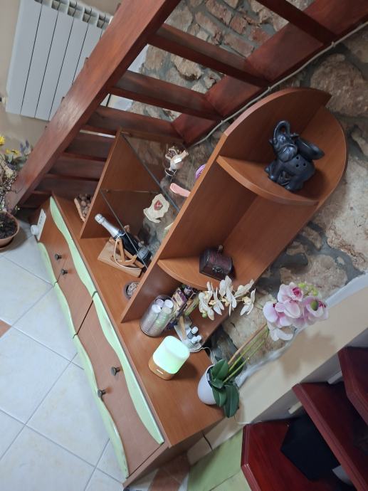 Prodajem zanimljiv ormarić koji se odlično uklapa u manje prostore. Ima drvenu konstrukciju u kombinaciji prirodne smeđe boje i svijetlozelenih elemenata. Sastoji se od donjeg dijela s dva ormarića i dvije ladice, dok gornji dio ima višeslojne police različitih veličina koje su postavljene asimetrično. Ovo je funkcionalan komad namještaja koji pruža dosta prostora za odlaganje i izlaganje raznih predmeta. Police su praktične za ukrasne detalje, knjige ili druge sitnice, a donji dio nudi zatvoreni prostor za pohranu. Cijela konstrukcija je zamišljena za korištenje prostora u visinu, što je korisno tamo gdje kvadratura nije velika. Dimenzije su na slici
