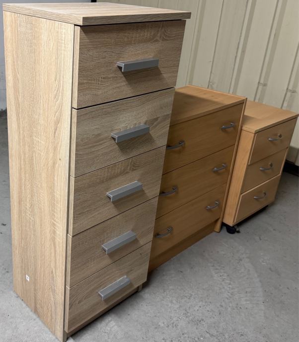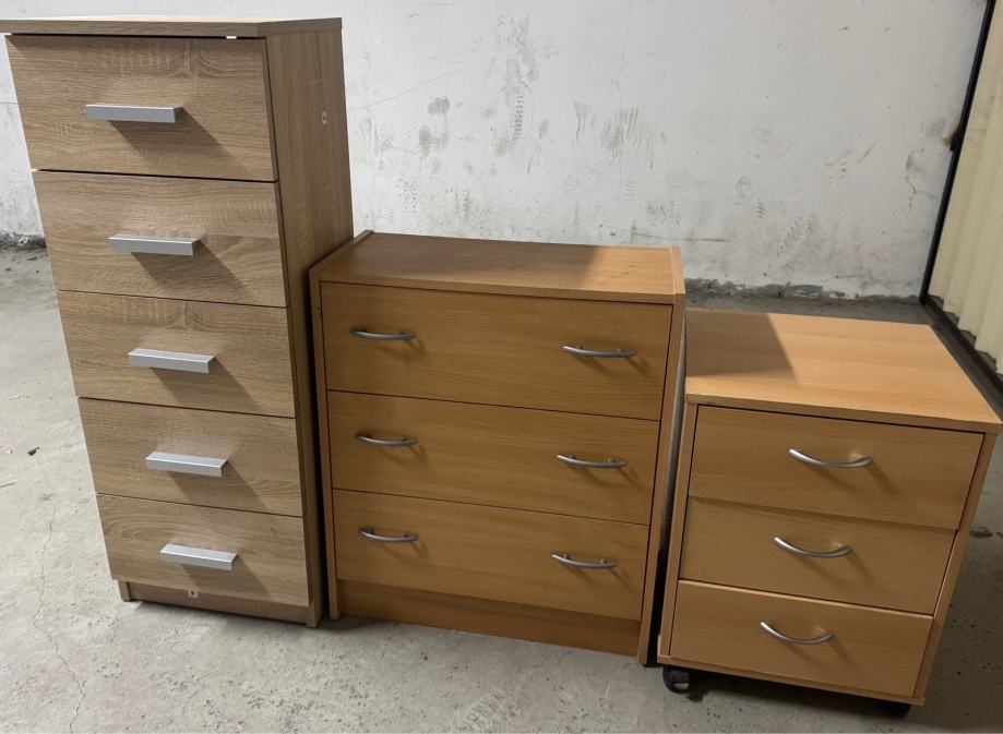 Ormarići - komode u dobrom stanju sa ladicama dimenzija sa 5 ladica 41 x 35 cm visina 108 cm , sa 3 ladice veća 60 x 30 cm visina 71 cm , sa 3 ladice na kotače manja 42 x 40 cm visina 57 cm , moguća kupnja u kompletu i pojedinačno te moguća dostava kupcu po dogovoru . Cijena je za sva 3 komada 50 eura .