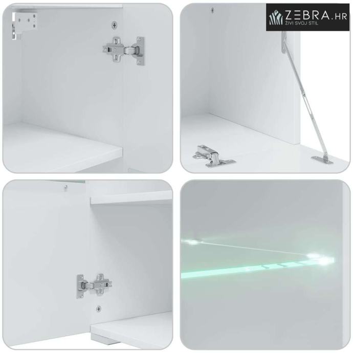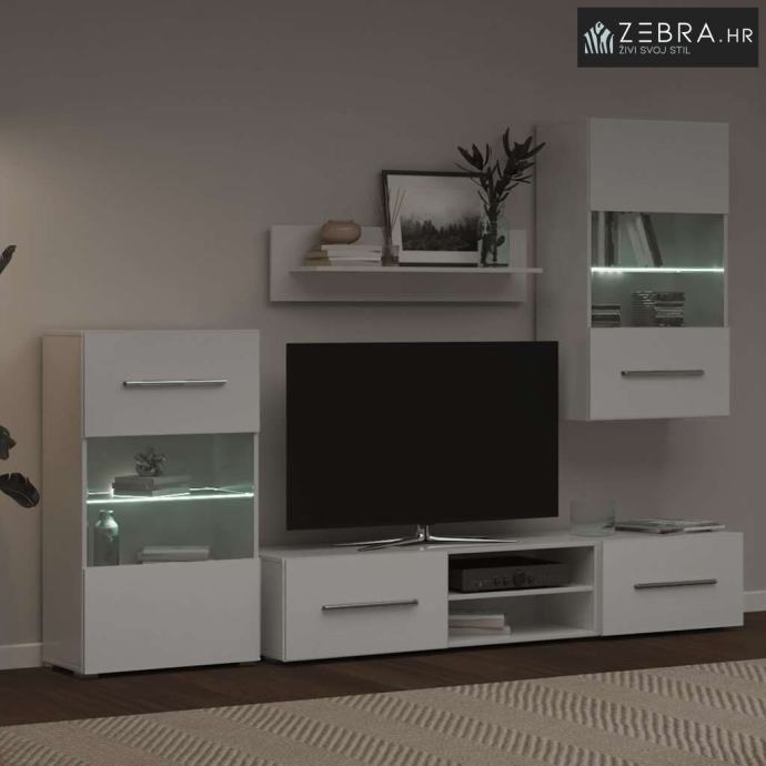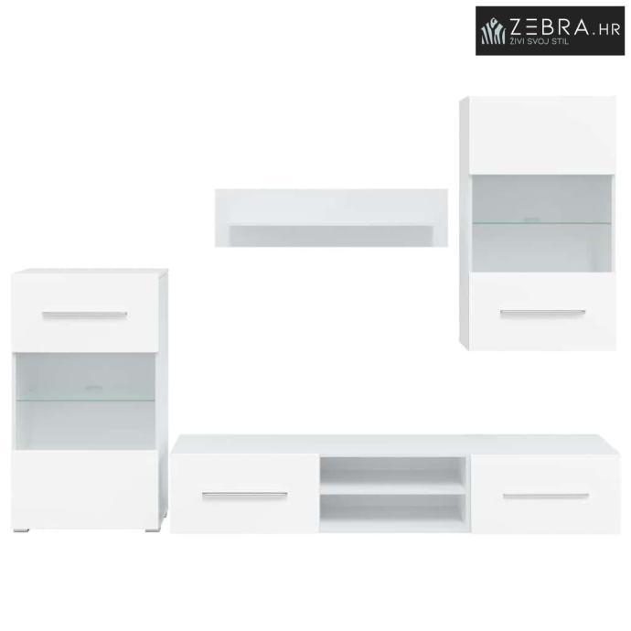 Ovaj set, koji se sastoji od zidnog ormarića, samostojećeg ormarića, dvaju TV ormarića i zidne police, pruža dovoljno prostora za spremanje vaših multimedijskih uređaja, knjiga i raznih manjih predmeta. Također će biti idealan za izlaganje ukrasnih predmeta, okvira s fotografijama ili čak lončanica. TV ormarići s vratima na spuštanje pružaju dovoljno prostora za čuvanje vaših knjiga, DVD playera, medijskih nosača itd. dobro organiziranima. Zidni ormarić i samostojeći ormarić opremljeni su djelomično ostakljenim vratima i trima policama, uključujući jednu staklenu policu s energetski učinkovitom LED rasvjetom u bijeloj boji.