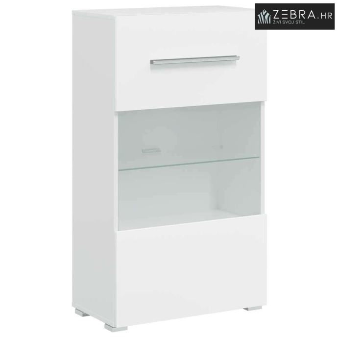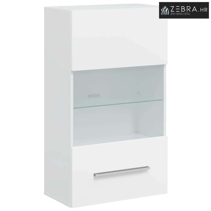 Naš set zidnih ormarića za izlaganje napravljen je od visokokvalitetnog konstruiranog drva s mat bijelom završnicom, a obrada u visokom sjaju na frontama doprinosi suvremenom izgledu i dojmu ovog seta, koji će odgovarati svakom uređenju.