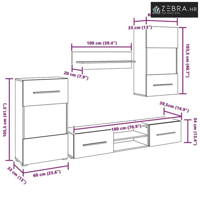 1 x veliki TV ormarić: 120 x 39,5 x 34 cm (Š x D x V)