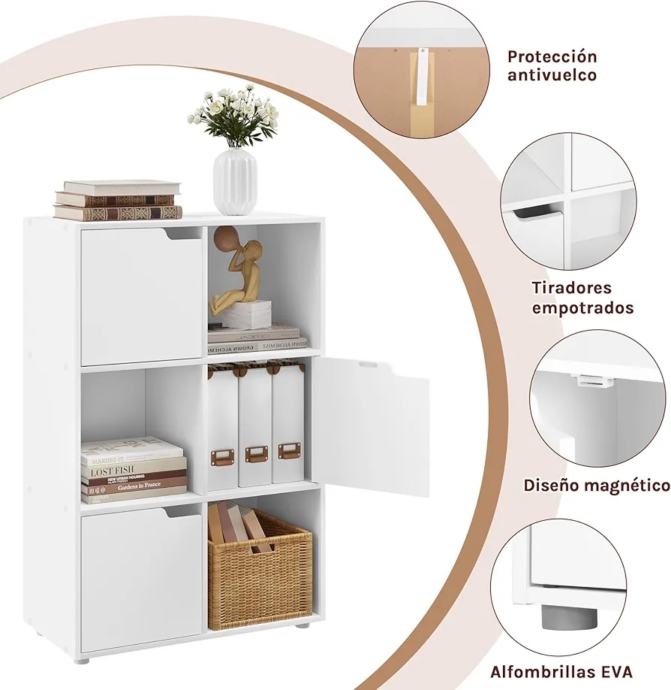 SK001ws Izložbene police za knjige, podne ili zidne, s 3 vrata, MDF, 6 odjeljaka, 59,6 x 29 x 91 cm