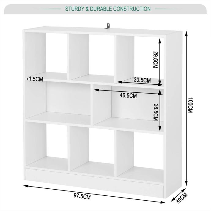 Ova samostojeća polica s 8 pretinaca modernog dizajna idealna je za dnevni boravak, ured ili radnu sobu. Kompaktna konstrukcija štedi prostor, dok otvoreni pretinci omogućuju praktičnu pohranu i izlaganje knjiga, ukrasa, dokumenata ili dekorativnih predmeta.
