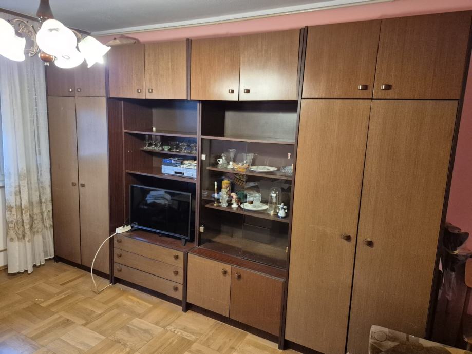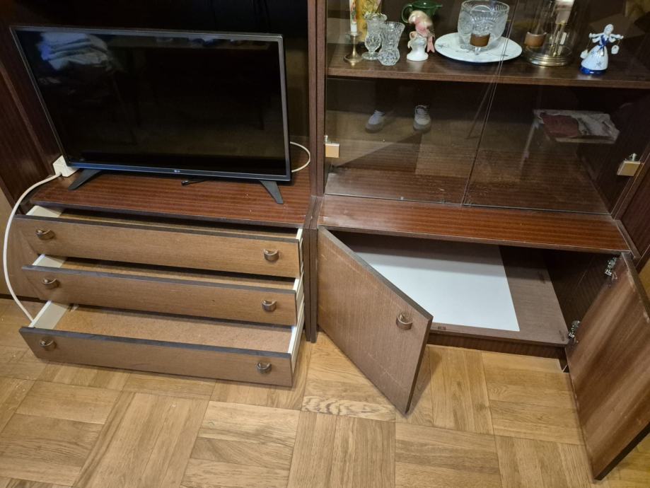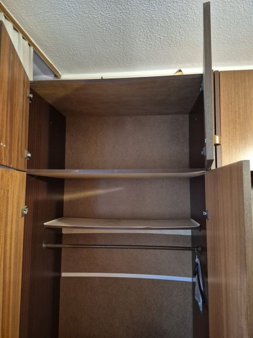 Bocni elementi su garderobni s dosta prostora za odlaganje a sredisnji dio je sa staklenom vitrinom, dijelom za TV, ladicama odnosno ormarićem.