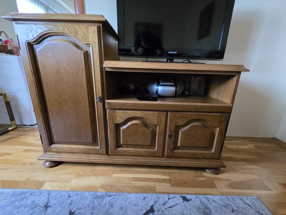 Komoda je izrađena od kvalitetnog hrastovog drva, idealna za dnevni boravak ili spavaću sobu. Sadrži ormarić s policama, savršen za organizaciju, i mali ormarić za čaše kako bi sve bilo uredno i nadohvat ruke.