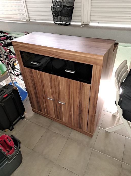 Prodajem set od komode i viseće ormarića u odličnom stanju. Komoda je u kombinaciji drvenog dekora oraha s crnim ladicama koje imaju metalne ručke. Ima dvije ladice u gornjoj zoni i dva donja ormarića s vratima. Konstrukcija je stabilna i funkcionalna, idealna za dnevni boravak ili hodnik.