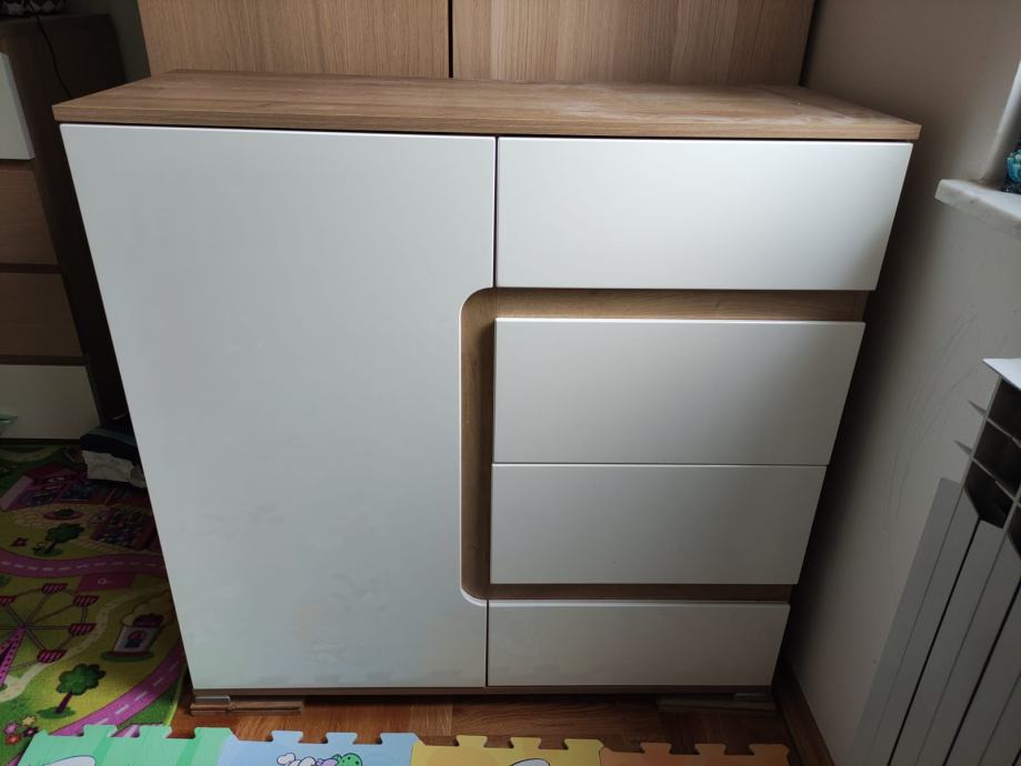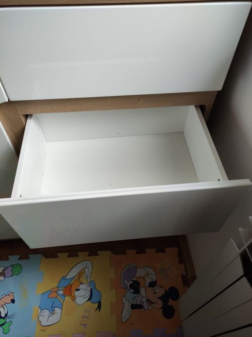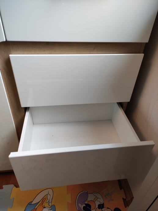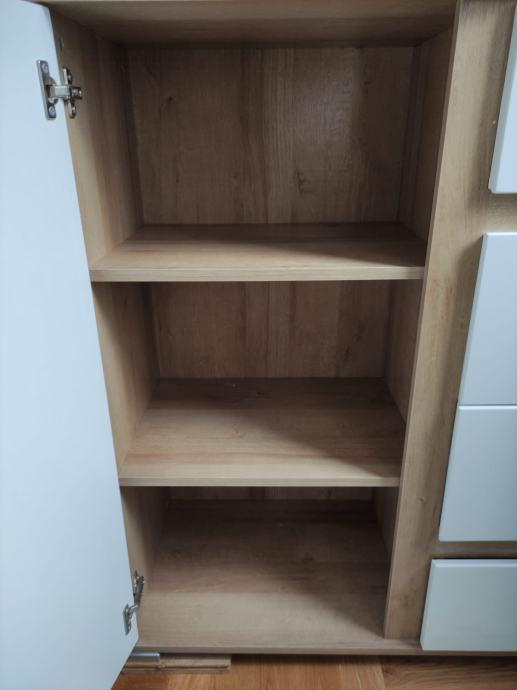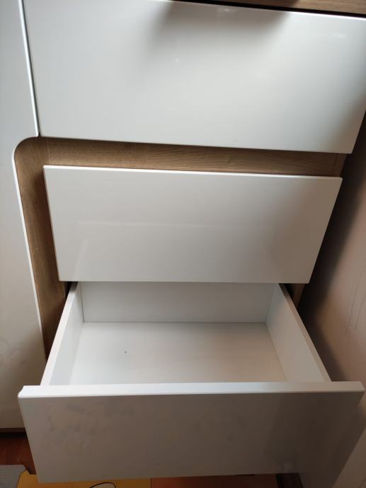4 ladice i jedna vrata s tri police. Fronte vrata i ladica su bijele boje visokog sjaja,